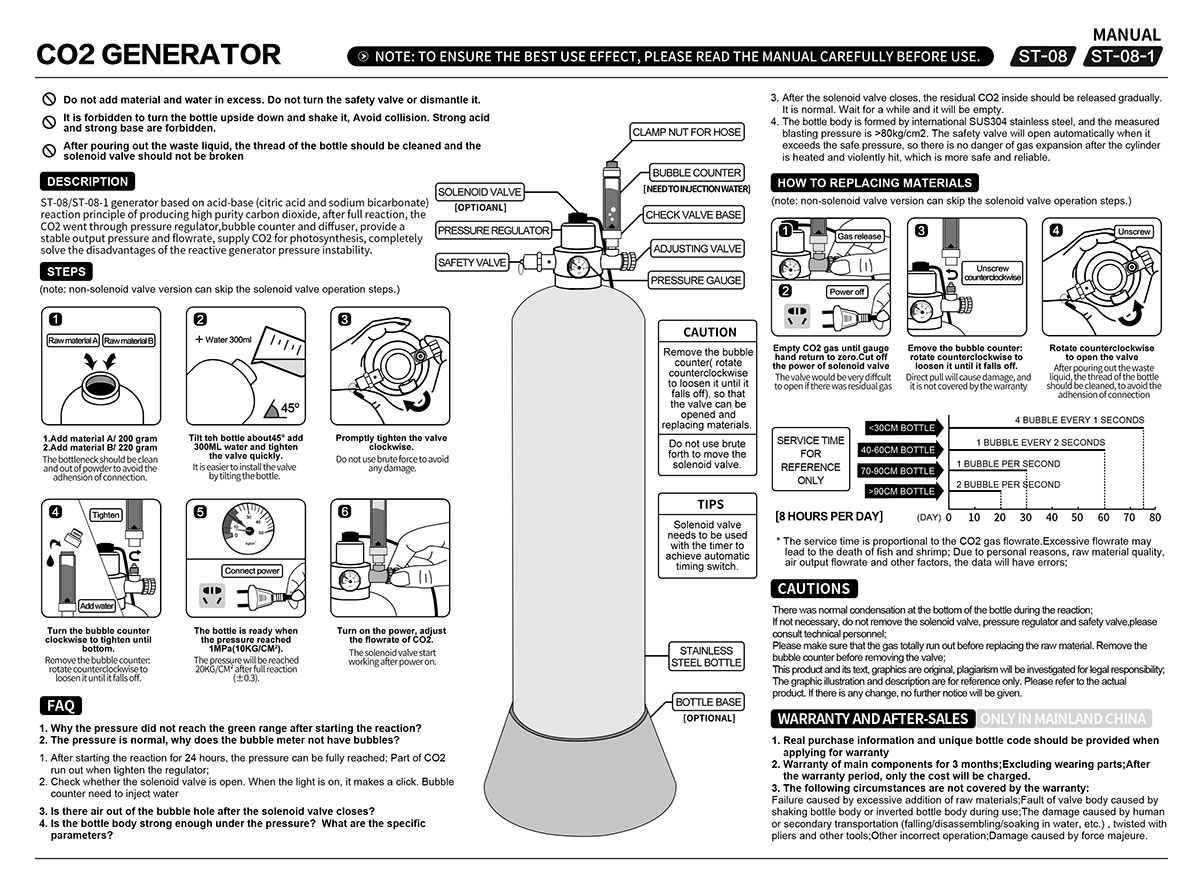 Das kompakte Design des Geräts ermöglicht eine einfache Installation in Aquarien unterschiedlicher Größe, ohne zu viel Platz einzunehmen. Benutzer befolgen einfach die Anweisungen, um den Reaktionsprozess einfach durch Zugabe der Rohstoffe zu starten und so eine einfache Bedienung und geringen Wartungsaufwand zu gewährleisten. Der stabile Ausgangsdruck ermöglicht es Benutzern, die CO2-Freisetzungsrate mithilfe des Blasenzählers klar zu überwachen und so die Zufuhr besser anzupassen, um eine ausgeglichene und stabile Aquarienumgebung aufrechtzuerhalten.